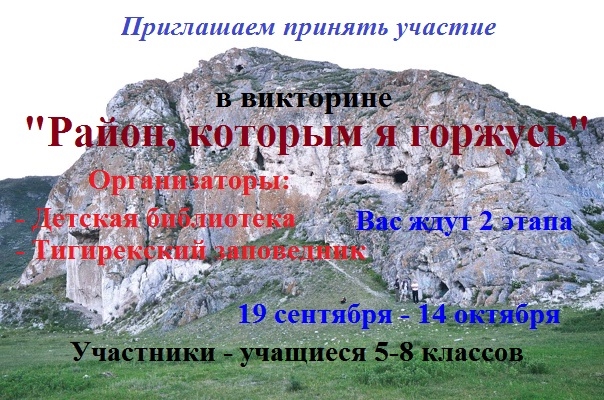 Администрации Краснощёковского района, МБУК «Краснощёковский МфКЦ», ФГБУ «Государственный природный заповедник «Тигирекский» приглашают учащихся 5-8 классов принять участие в викторине «Район, которым я горжусь».