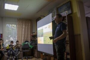 Программа началась с просмотра документального фильма «Сокровища природы Кытмановского района». Затем специалист по экологическому просвещению национального парка «Салаир» Александр Скачко рассказал о новых открытиях «караванщиков» на территории района, в том числе в Пионовой степи. Шесть краснокнижных видов растений и животных для этого степного участка – итог полевой работы юных исследователей природы. Это лишний раз доказывает уникальность данной территории. Также Александр пригласил к участию в проекте школьников и их учителей.