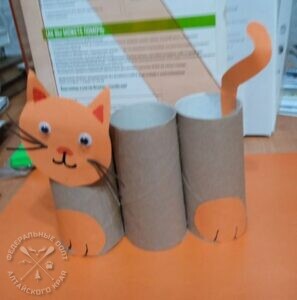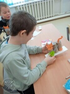 Во второй части занятия Тамара Михайловна организовала мастер-класс по изготовлению карандашницы в форме котика из картонных втулок. При помощи степлера соединили втулки, и дети с удовольствием принялись за работу. Они раскрасили фломастерами мордочку, вырезанную из цветной бумаги, приклеили усики, хвостик и лапки. Затем к готовой подставке прикрепили донышко. В итоге из бросового материала ребята смастерили карандашницу с веселым котиком. Получилась оригинальная поделка, красивая и полезная вещь для письменного стола. Дети остались довольны своими поделками и продемонстрировали их на общем фото.