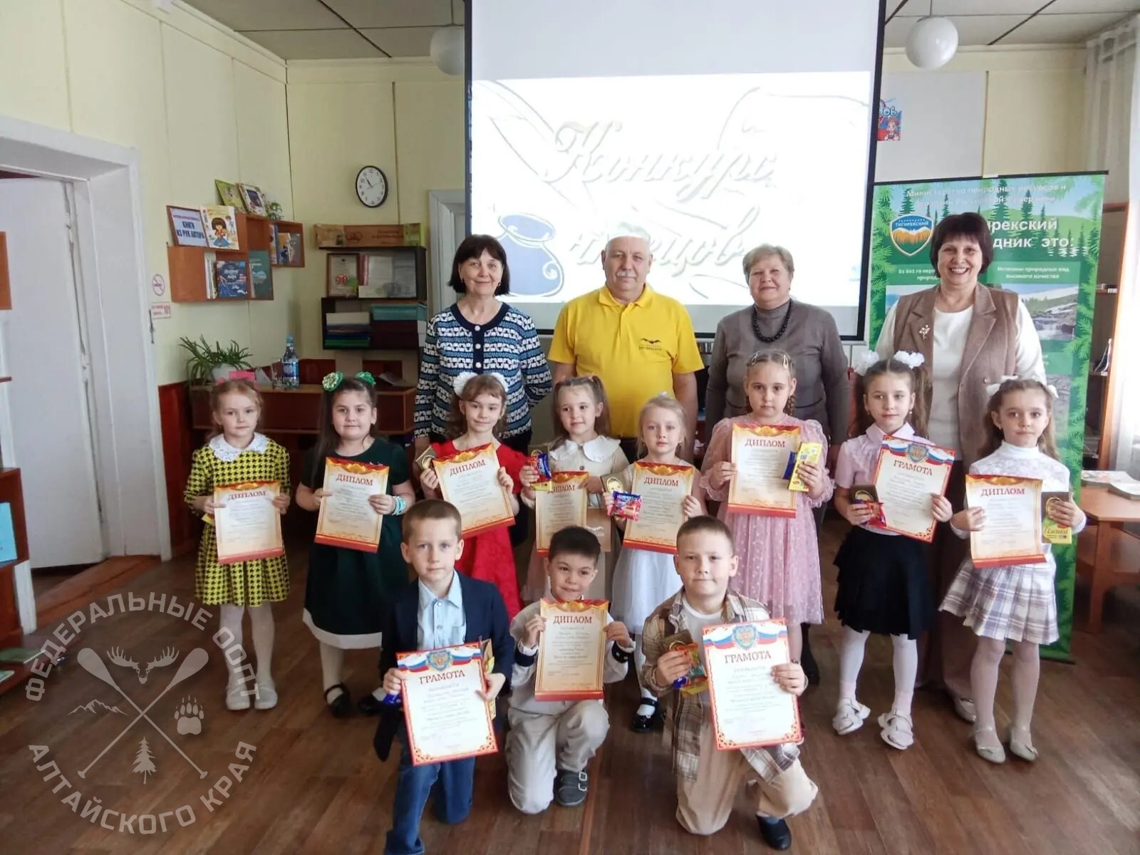 Все участники получили сладкие призы. Особые подарки от Тигирекского заповедника были вручены тем, кто читал стихи о природе: Вике Катаевой, Александру Полковникову , Ярославу Меркулову и Лере Уваровой.