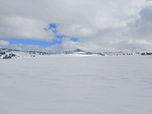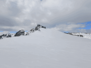 Южный склон: на вершине снег практически отсутствовал, местами виднелась голая земля. По мере спуска толщина покрова увеличивалась до 1,5 метров.